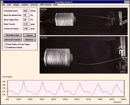 This project was a collaboration with the textile department. The Unwinding Analyzer is a PC-based measurement system for high-speed yarn unwinding. It measures the tension in the yarn and takes snapshots of the yarn path. The yarn path is then determined by image processing, and the yarn tension and the path can be compared with theoretical calculations.